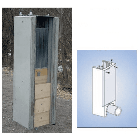 A Monk system is a hydraulic structure, to control water levels in the lake. It typically involves a vertical shaft built into the lake’s embankment, connected to a drainpipe. Removable wooden boards or a gate are used to adjust the water level, allowing for drainage, overflow regulation, and easier access to the lake for both repairs and fish (in the case of a fish farm for example).